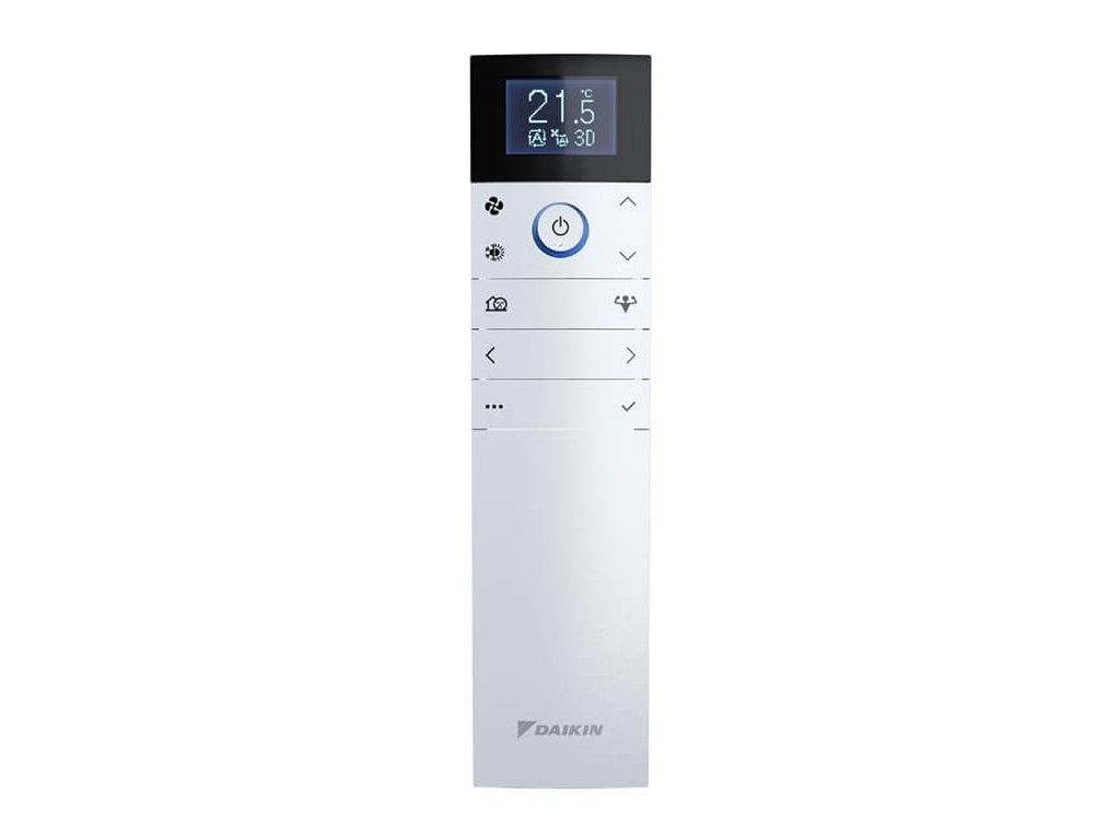 Diaľkový ovládač Daikin Emura má minimalistický dizajn so zakrivenými líniami, pixelovou obrazovkou a modrým okom Daikin. Je kompaktný a dokonale padne do ruky. Diaľkový ovládač môžete jednoducho pripevniť na stenu pomocou magnetu.